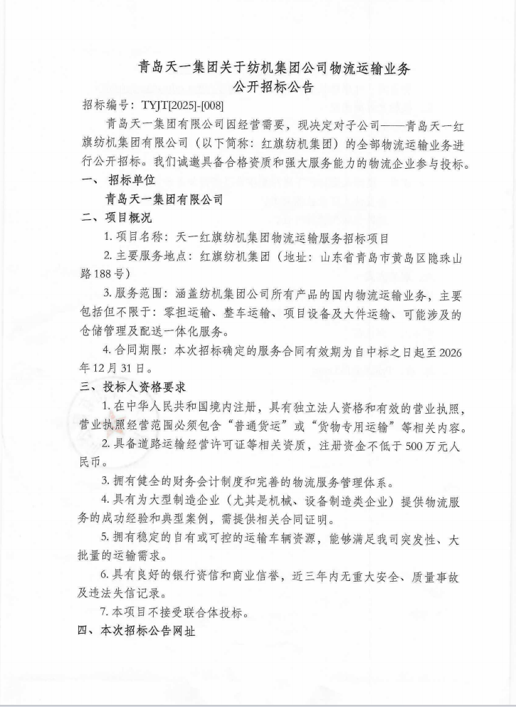 • 青島天一集團(tuán)關(guān)于紡機(jī)集團(tuán)公司物流運(yùn)輸業(yè)務(wù)公開(kāi)招標(biāo)公告
