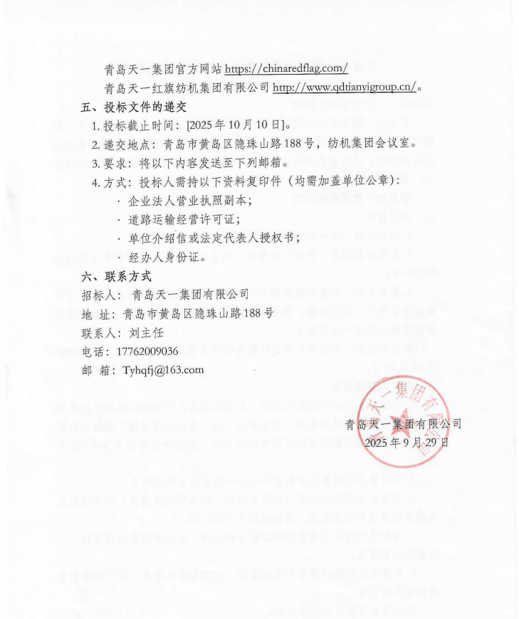 青島天一集團關(guān)于紡機集團公司物流運輸業(yè)務(wù)公開招標(biāo)公告